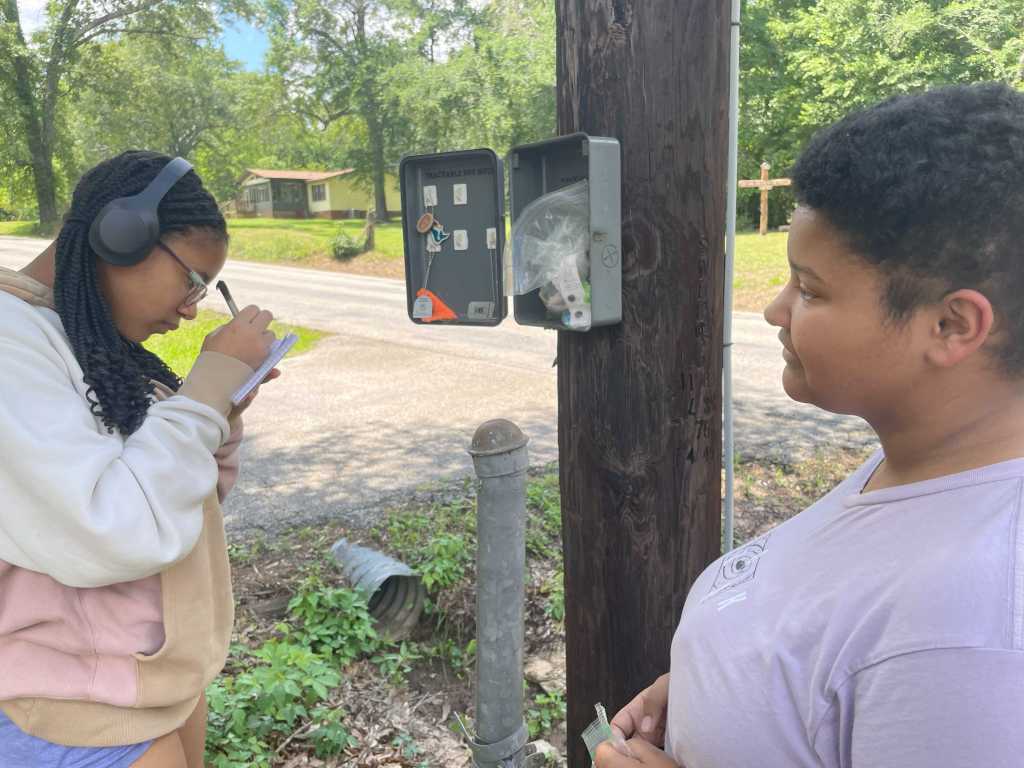 A little later in the day, we did something old and something new. My older daughter is working on getting her driver’s license, so I let her take us on a short drive today. Our drive ended at another cache. Many years ago, I found a trackable hotel in an unexpected location. Once my older daughter became a cacher, I took her out to it as an excuse to switch out some trackables. Today, she drove my younger daughter and me out to it so her sister could sign it just as we had. I again took the opportunity to switch out my three trackables for the three inside, but we had to take a figurative detour as we discovered that the cache was brimming with ants and larvae! I felt the need to do a little cleaning and figured that starting with some water to wash out the invaders would be a good start. Alas, I had already drunk all my water. My younger daughter went for her bottle, but it was also drained. In an unparalleled act of sacrifice, my older daughter gave of the water from her bottle. She even allowed some of the ice inside to spill out, losing a major portion of the cooling anima contained within. Truly, considering all she had given, she will no doubt be enshrined in the pantheon of the saintliest geocachers! As I flooded the insects away (neither of the girls wanted to get near them), the younger noted that the cache was for travel bugs, not real ones.