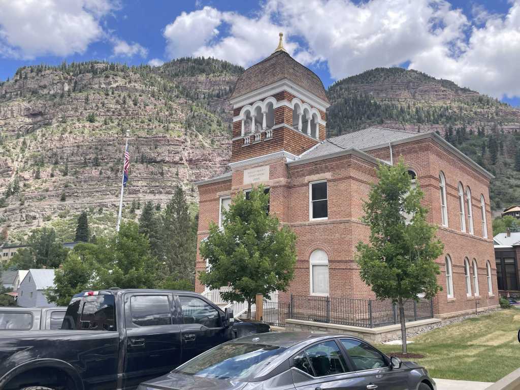 Ouray was celebrating the Fourth of July. Unlike Telluride, however, they were more lowkey, opting for a baseball game, frolicking in the park, and other smaller diversions instead of a giant, community summoning one. Or so I thought initially. When I entered town, I found my self partially blocked by people seated in the street. Perhaps I had missed their parade or some other event, but I had to do some strategic redeployment to find my way to the Ouray County Courthouse, which was far more sedate than San Miguel County‘s had been. For some reason, I had expected a larger and grander courthouse, but it was well sized for the small town and I like the belfry, which seemed to be becoming my new favorite feature on courthouses. As a minor sidenote, there’s a library around the corner that I mistook for the courthouse because it had a tower and more impressive tower. I’m not going to complain about places of learning being more grandiose than the halls of power.