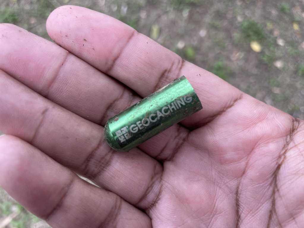 I had to run up to Georgetown, so I decided to go ahead and grab a cache in the area. My first attempt was at a park not far from the center of town. I had been there a couple of times before, but both times it was crawling with kids and I didn’t want to be that guy, so this was my first time I could really get close to it. At least, I think I was. Unfortunately, I was 98% sure that the cache was either inside or behind a relatively thick bamboo fence, growing in front of another fence. The cache is a few years old and I know how fast bamboo can grow so I have no doubt that the bamboo was more manageable when it was placed. Ultimately, I just didn’t feel like rooting around in bamboo for it. I called it, thinking I’ll return another day when I’m feeling more in the mood. I started heading back to the car when something green and shiny caught my eye on the ground, or rather in the ground since it was pushed down into the soil after being trodden under foot. I picked it up and behold!