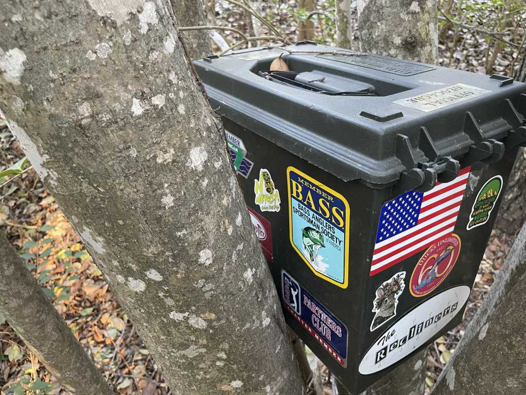 Saturday I was coming home from running an errand when I remembered that I needed to find a cache. Since I was in a part of town that I don’t usually find myself in often, I thought there should be a plethora of options. I was incorrect; the area has been traditionally economically depressed but has been gentrifying to an extent in the last few years. There weren’t a bunch of caches (though I guess that opens up some opportunities if I’m so inclined), but there was one that stood out in a sea of nothing. It was in a greenspace I didn’t remember ever knowing about, and it was large! Don’t see a lot of those floating around. It even filled in a D/T for a Treasure (I haven’t finished that darn puzzle and 1.5/2.5 is not especially common). Sounded like a winner to me! When I arrived, I figured out why I had never been to that greenspace before. The entrance to it was on the back end of a University of Texas lab facility I didn’t even know was there. I knew about the big one on my end of town (I’d even gotten caches there before), but this one was a mystery to me. I pulled into the parking lot worried that there might be some kind of security, but who would put a cache inside a security perimeter (other than maybe a Virtual, but that’s a different discussion)? On a Saturday afternoon, the gate was open, two cars were parked, and I would be nowhere near either of them. I parked at the end of a path into the woods. I realized that I could have driven the path to get to the cache (the CO kindly left a convenient parking waypoint a few feet from the cache for those willing to do so), but opted to walk it instead. I was only about 800 feet away so why not? After a quick little jaunt down the path I got to GZ and saw behind the treeline a great black case covered in stickers. I was happy to find the case, and yet I couldn’t help thinking that it was smaller than I imagined it would be. Since a large is defined as a five-gallon bucket, it was large (substantially bigger than an ammo can), but still … lesser.