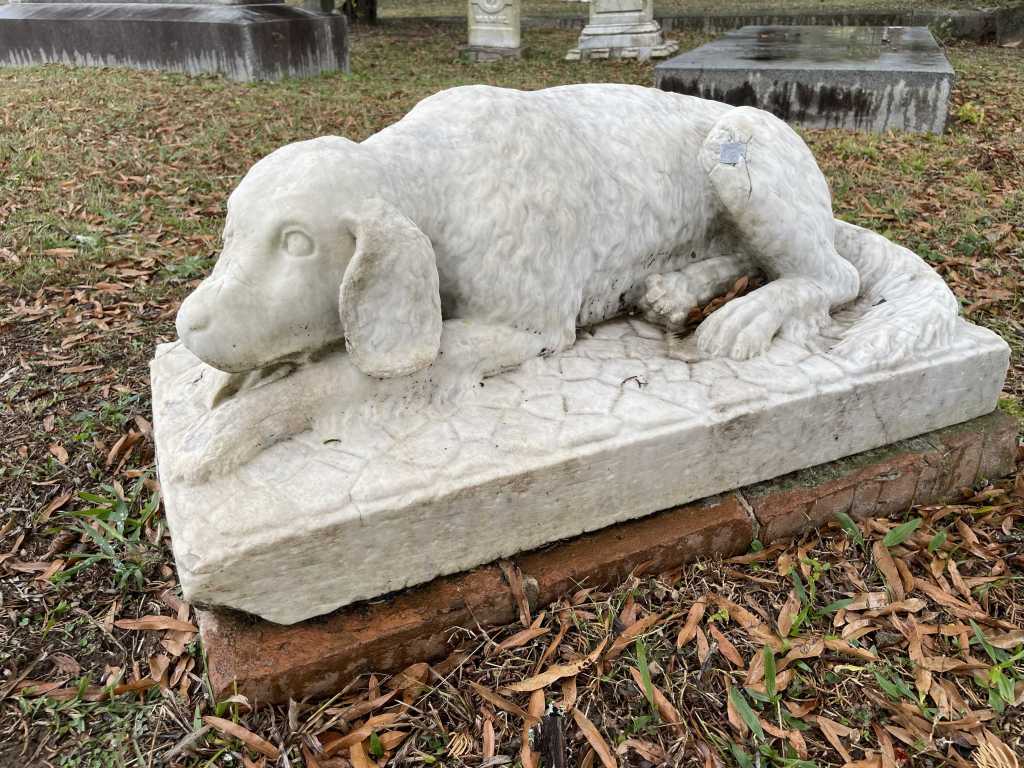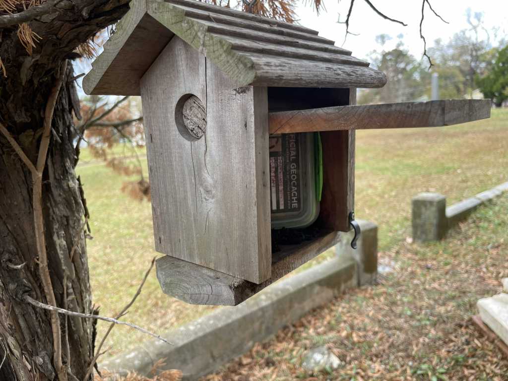 The cache was a birdhouse in a nearby cemetery (there always is one). I missed out on the grave of Eudora Welty, but I had no idea where it was and had neither the time to search it out nor the desire to search in the rain. But I did see a different grave, that of the Simms dog. Supposedly, when the young daughter of the family Simms died, their dog came and sat at the foot of her grave every day until it passed away. This is a bit of local legend; the dog’s grave had no dates on it as you would expect a grave to have. But as local legends go, it’s harmless and even nice. Who could possibly hope for that kind of devotion except from a dog?