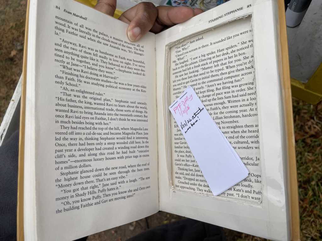 Friday morning I noticed a new cache had dropped (actually, several did, but this one was close enough for me to note). I set out during lunch to go get it. I didn’t immediately get it by looking at the map, but it was across the street from a park that I have gotten a number of now archived caches at before, but that’s not important. I parked at a little free library which was conveniently, almost suspiciously, close to GZ, and gave the exterior a look. Seeing nothing of note outside, I opened the door and began looking at the book spines within. After a moment, I saw a book with the same name as the cache and pulled it out. Within was a hollow section with a log but the log that I expected to be clean and untouched by ink disappointed me. Another cacher, one known for grabbing FTFs, had beaten me there, but hadn’t logged it yet. A sad trombone warbled in the back of my head. Worst episode of Reading Rainbow EVER! But I had a cache for the day, so that’s what mattered. I put my own inscripsi on paper and then logged it online, noting that while I had not been the first to sign it, I was the first to log it. I submitted it and my log appeared. Except, there was another log where there had not been one a moment before. In the minute that I had spent logging it, the other cacher had submitted his log as well, apparently moments before I had, making my statement of being first to log useless! I comically shook my fist at my timing! But what did I really care? A cache is a cache is a cache.